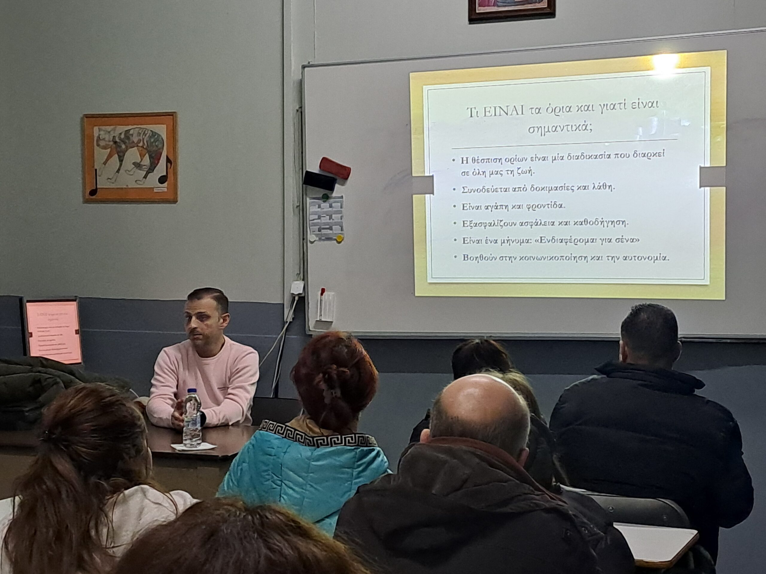 Θέμα της συνάντησης ήταν «Όρια και Πειθαρχία», ένα ιδιαίτερα σημαντικό και επίκαιρο ζήτημα για τη διαπαιδαγώγηση των παιδιών. Εισηγητής της συνάντησης ήταν ο κ. Χ.Κρυωνάς, Κοινωνικός Λειτουργός του Κέντρου Πρόληψης της χρήσης εξαρτησιογόνων ουσιών, νομού Σερρών «ΟΑΣΙΣ», ο οποίος παρουσίασε το θέμα με τρόπο κατανοητό, ουσιαστικό και άκρως ενδιαφέροντα, δίνοντας τη δυνατότητα για γόνιμο διάλογο και προβληματισμό.