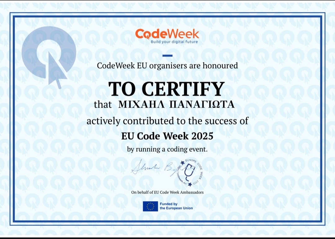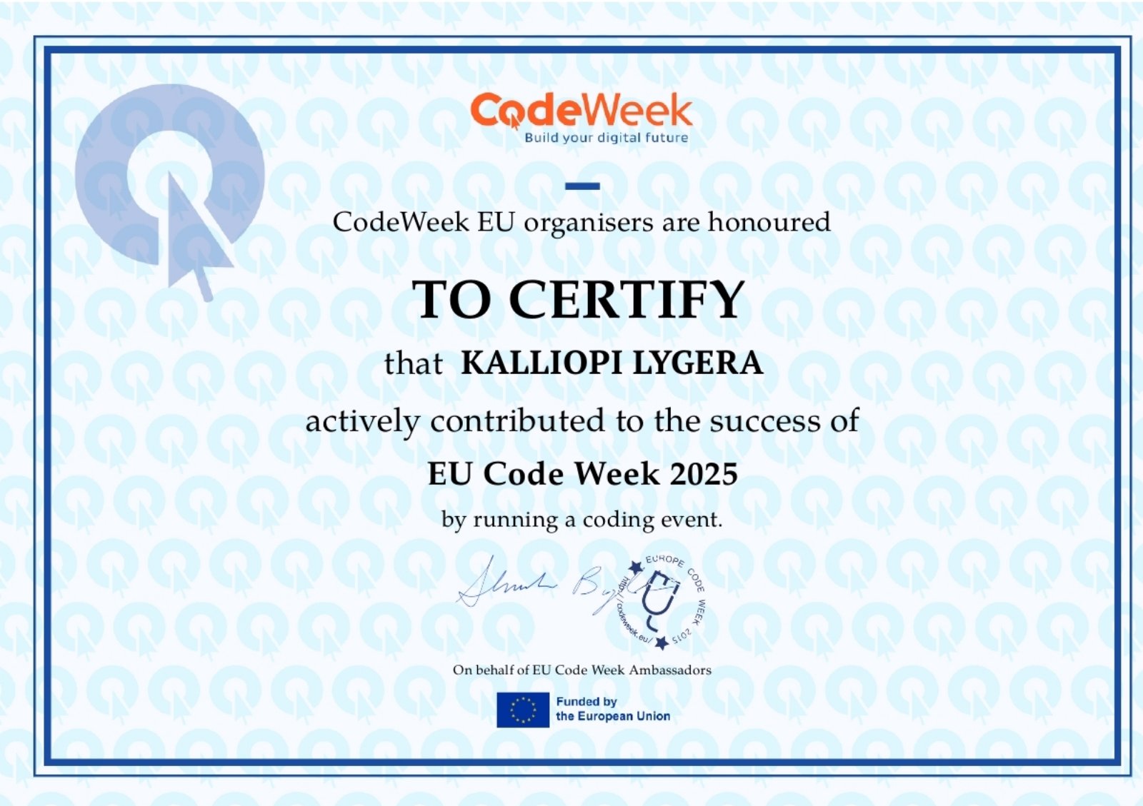 Η “EU Code Week Greece” είναι η ελληνική εκπροσώπηση της ευρωπαϊκής πρωτοβουλίας EU CODE WEEK, που γιορτάζεται κάθε χρόνο τον Οκτώβριο και στοχεύει στην προώθηση δεξιοτήτων και της εκμάθησης προγραμματισμού. Η Ελλάδα συμμετέχει διοργανώνοντας εκατοντάδες δραστηριότητες σε όλη τη χώρα, όπως εκδηλώσεις σε σχολεία, πανεπιστήμια και κοινοτικούς χώρους.