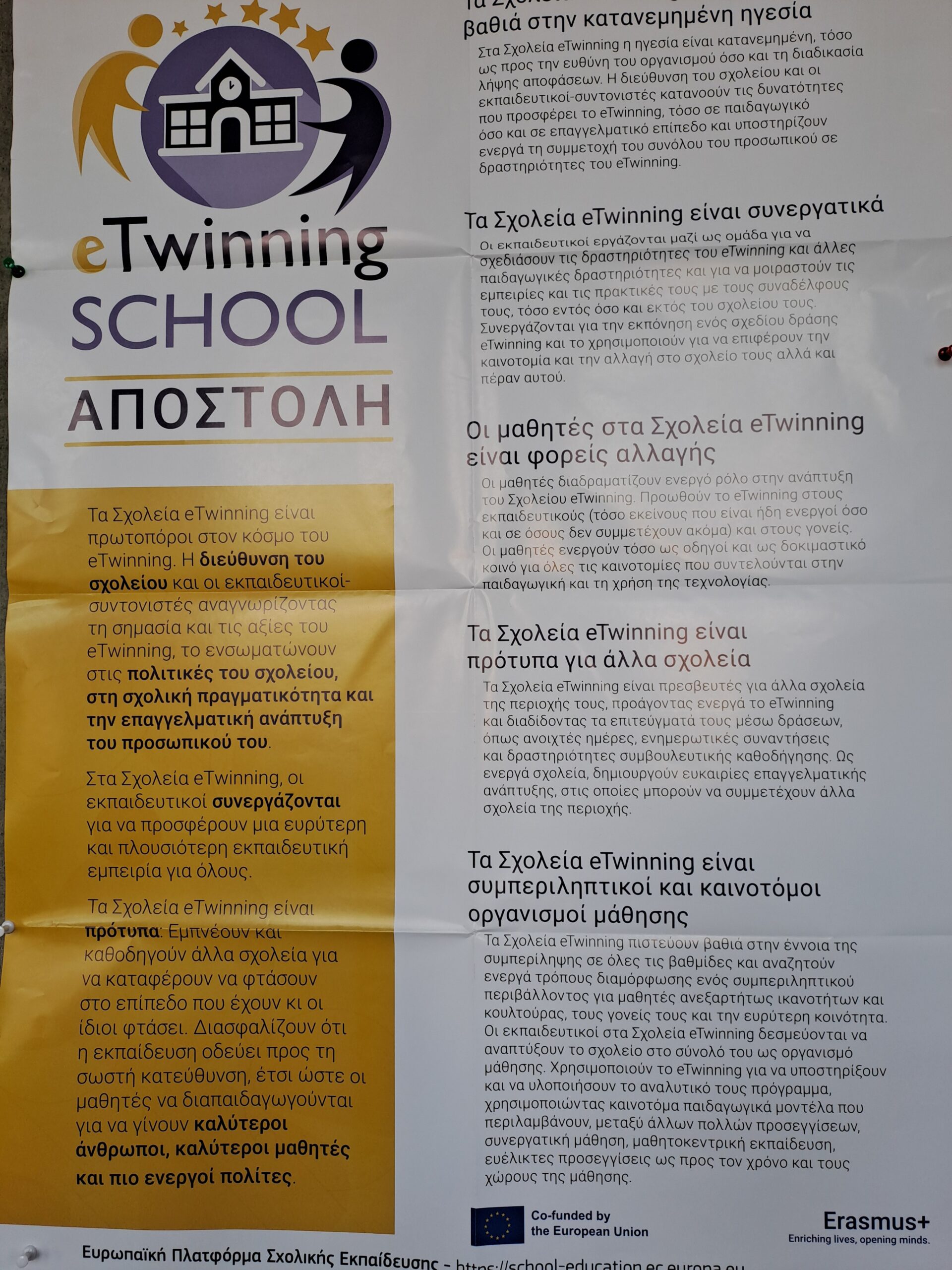 Με την απονομή της ετικέτας, το eTwinning αναγνωρίζει τη συμμετοχή, τη δέσμευση και την αφοσίωση όχι μόνο των μεμονωμένων eTwinners, αλλά ολόκληρου του σχολείου, όπου συνεργάζονται ομάδες εκπαιδευτικών και διευθυντών. Τα σχολεία eTwinning είναι συνεργατικά ,συμπεριληπτικά ,καινοτόμα και οι μαθητές τους διαδραματίζουν ενεργό ρόλο στην εκπαιδευτική διαδικασία.