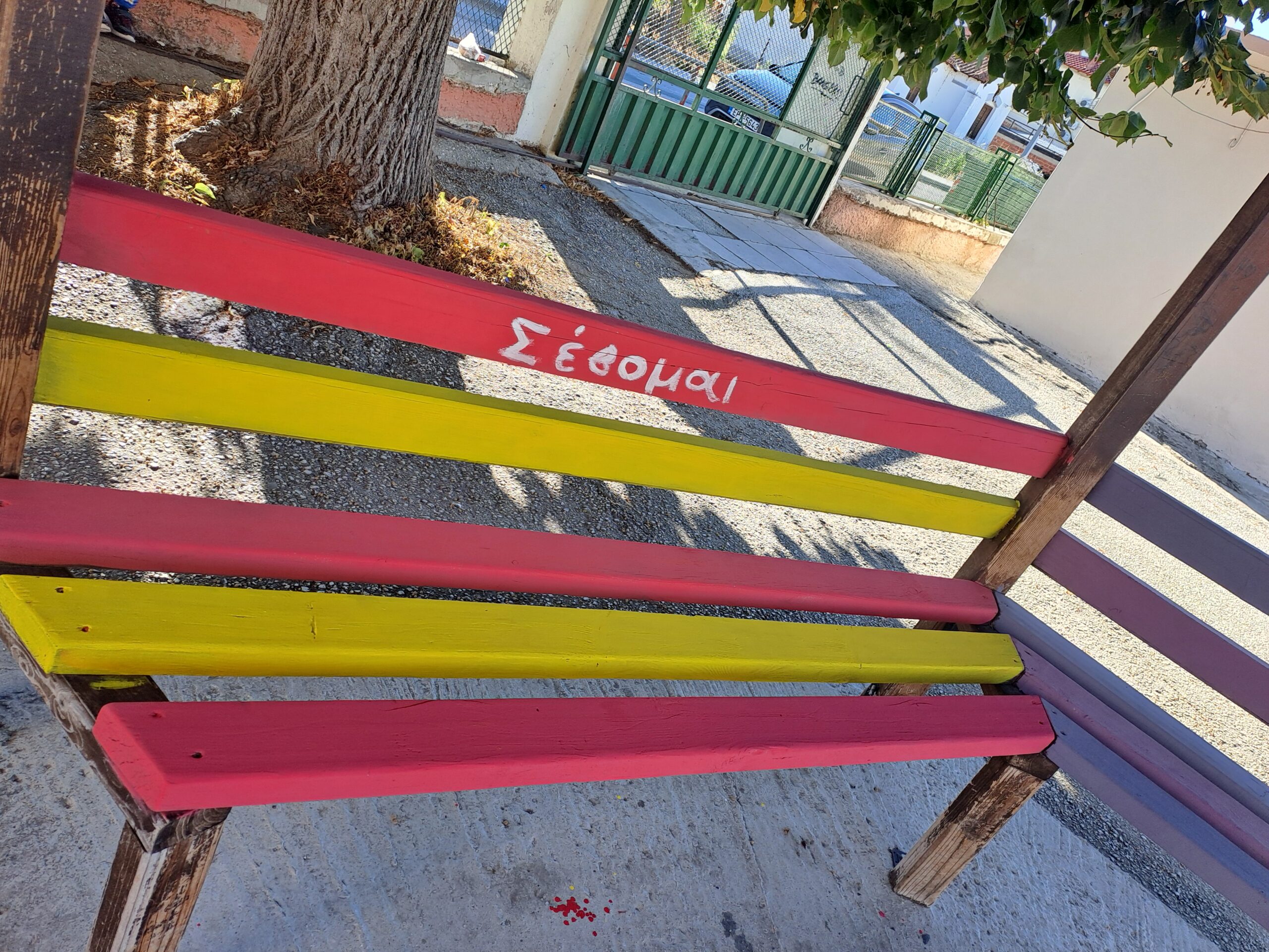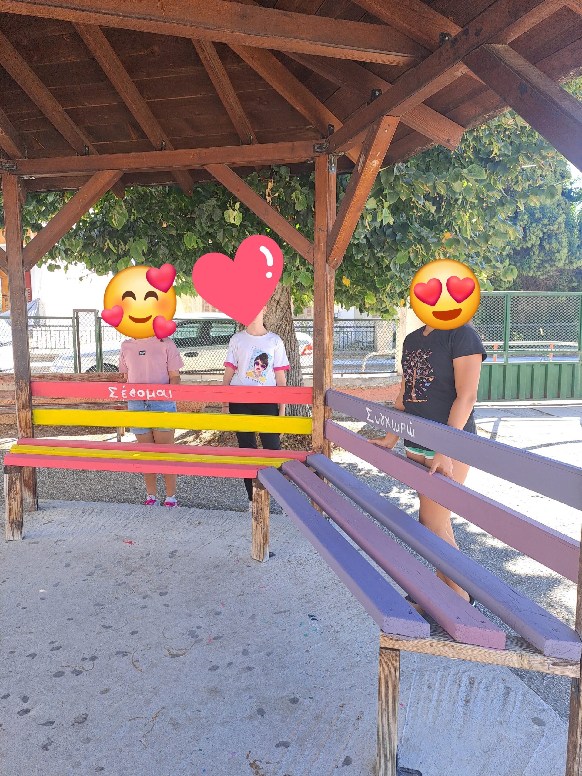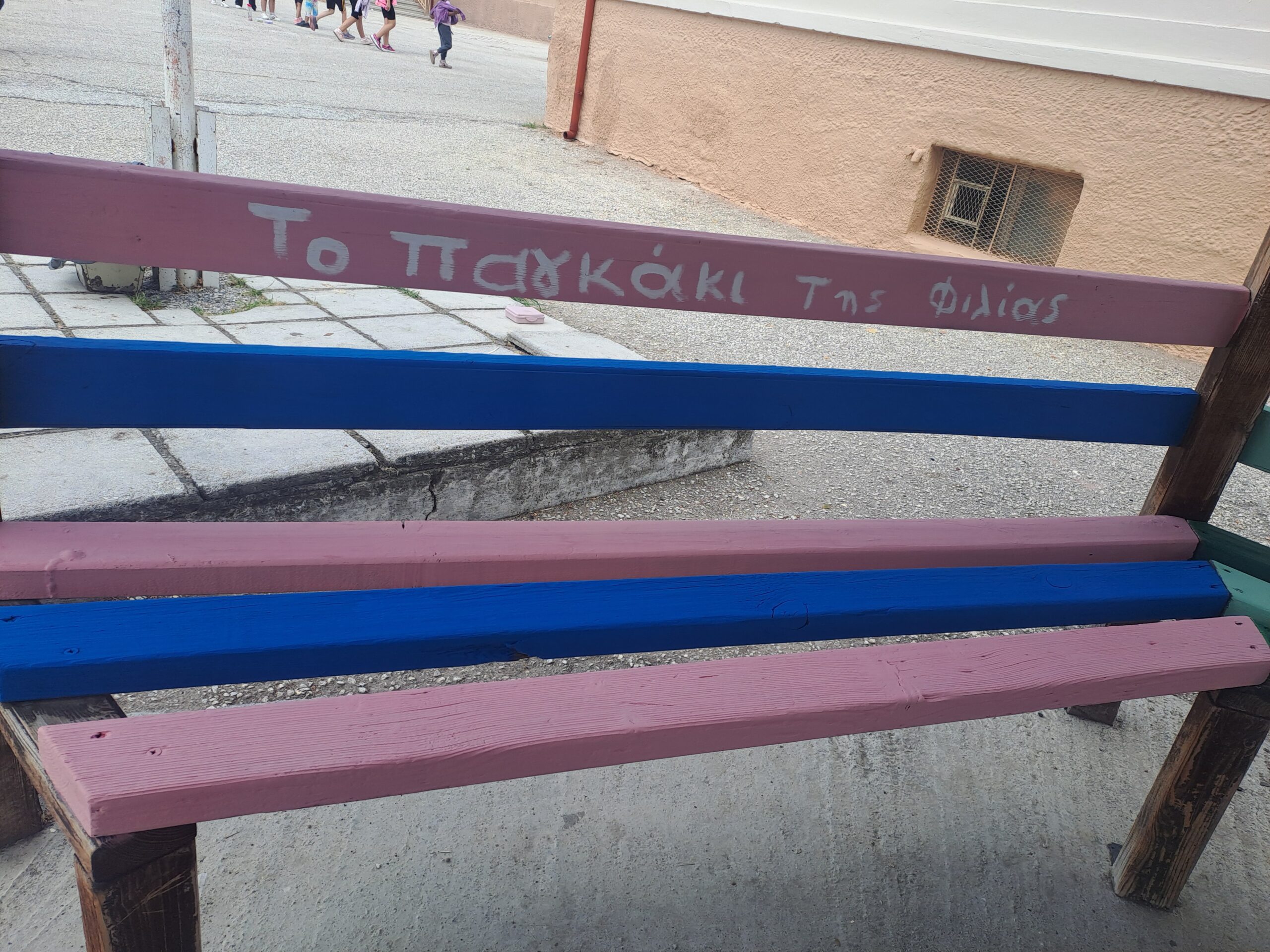 Η εκπαιδευτικός Φυσικής Αγωγής του Σχολείου μας κ. Θρήσκου Δ. αποφάσισε ,με τη βοήθεια μαθητών, να ομορφύνουν συγκεκριμένη γωνιά της σχολικής μας αυλής, περνώντας ταυτόχρονα όμορφα μηνύματα σε μικρούς και μεγάλους. Η εικαστική παρέμβαση , λοιπόν, στην ανατολική είσοδο του Σχολείου φιλοξενεί μια όμορφη «Καλημέρα» , αλλά και το «παγκάκι της φιλίας» ,που είναι μια ιδέα που εφαρμόζεται συχνά σε σχολεία και παιδικές χαρές. Είναι ένα παγκάκι με ξεχωριστή σημασία: