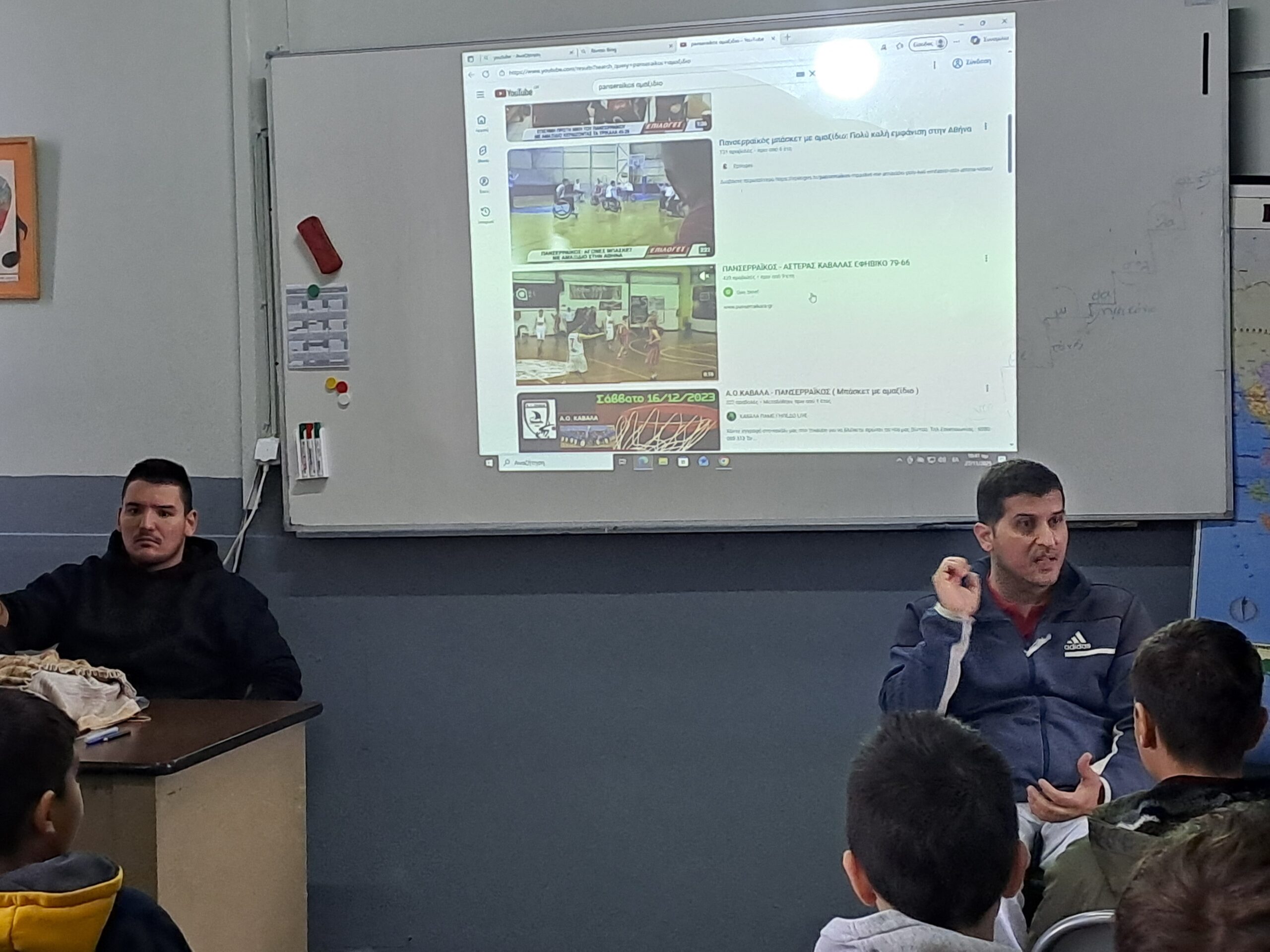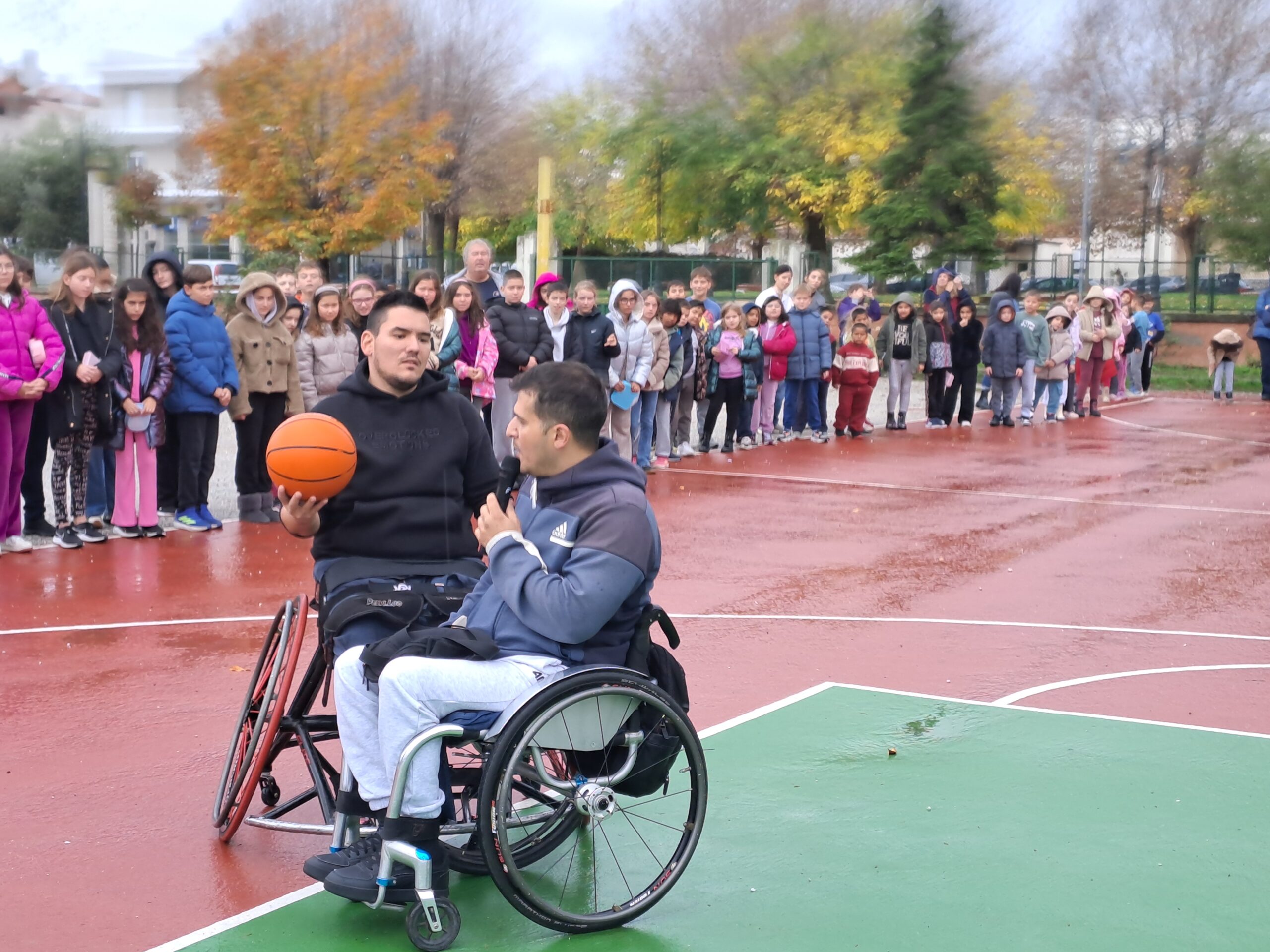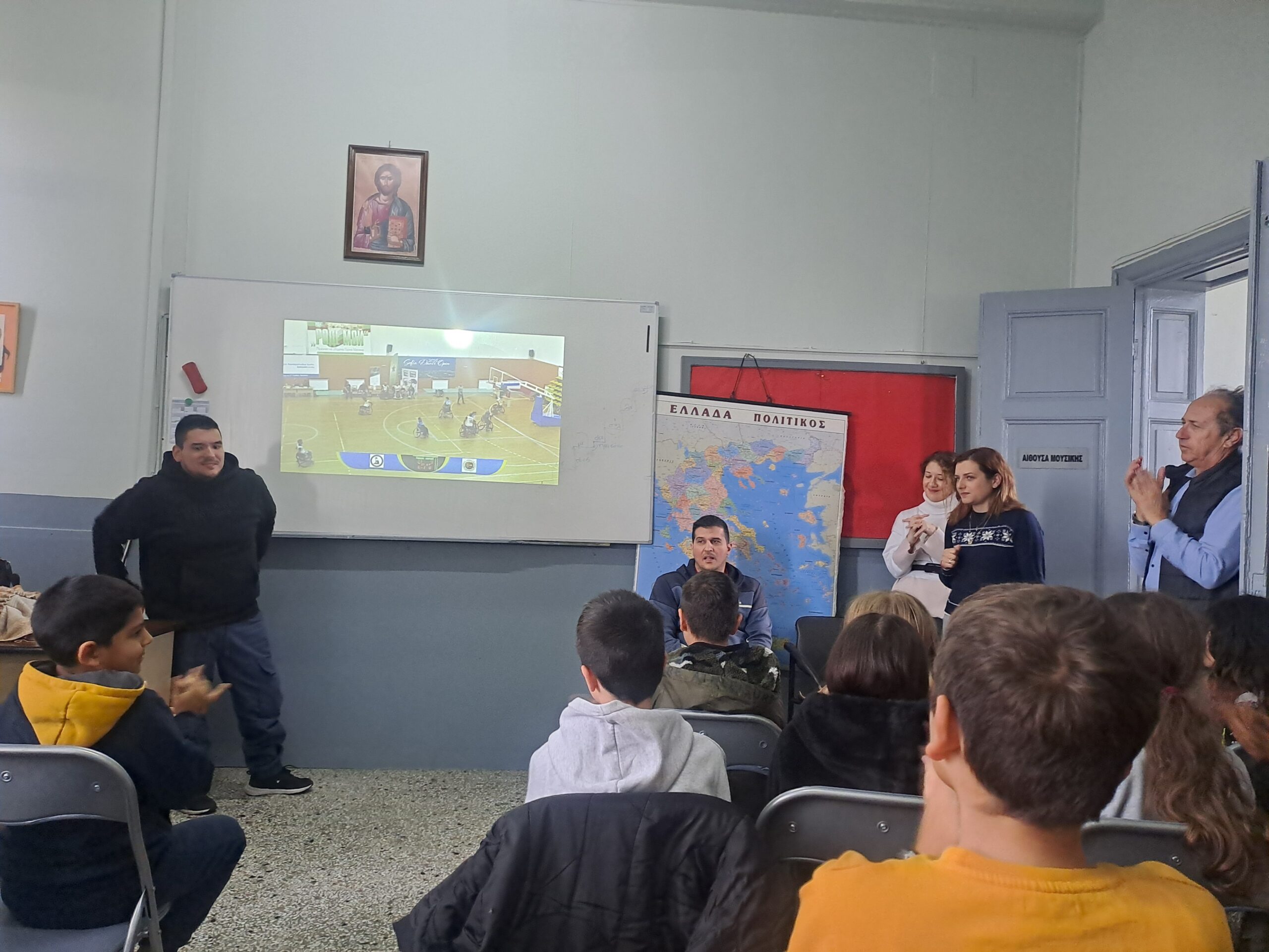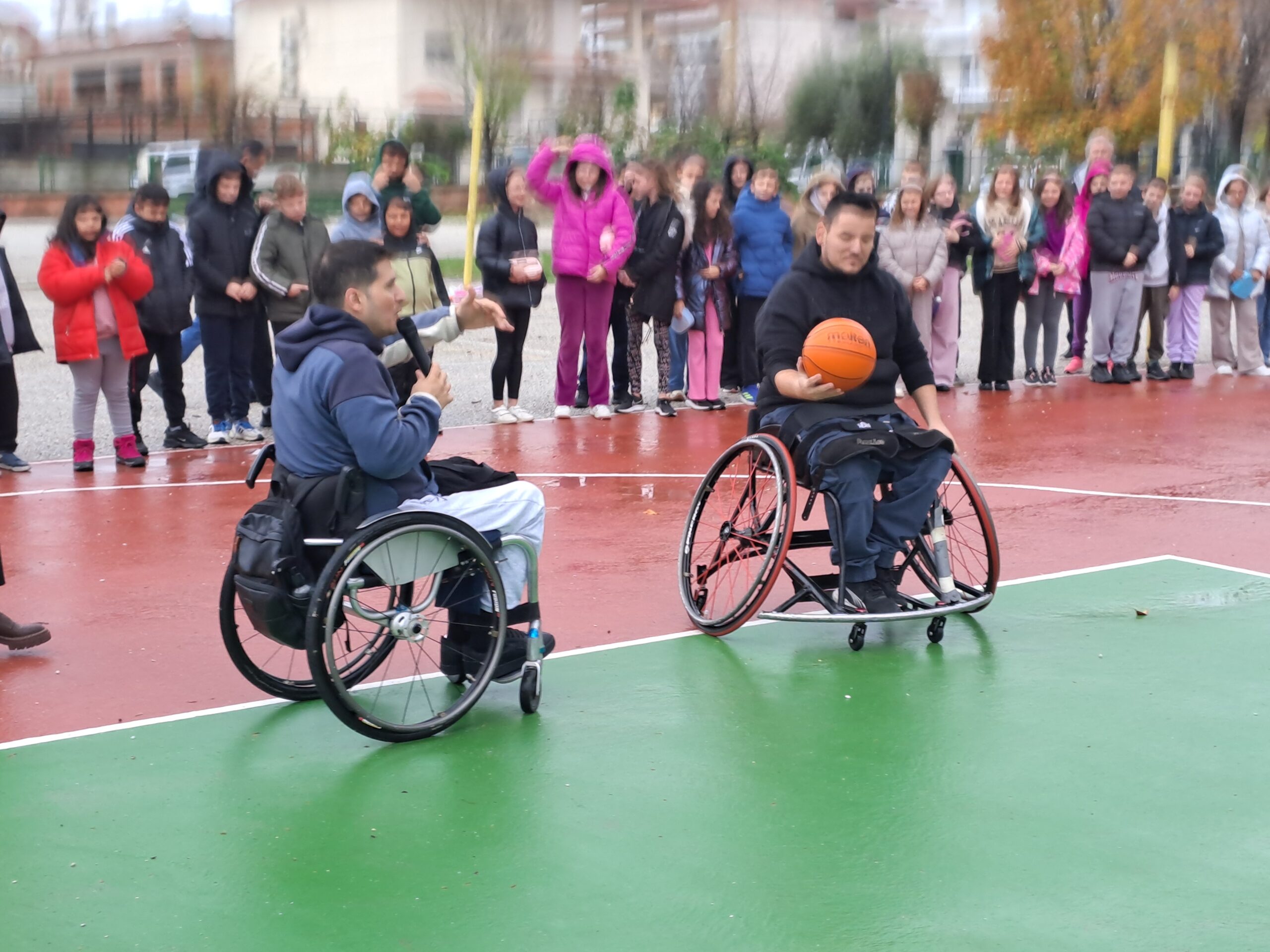Οι μαθητές μας είχαν την ευκαιρία να κάνουν ερωτήσεις και να λύσουν τυχόν απορίες τους. Αυτό που τους έκανε εντύπωση και τους ενθουσίασε ήταν η επίδειξη καλαθοσφαίρισης με αμαξίδια στο γήπεδο του Σχολείου μας.